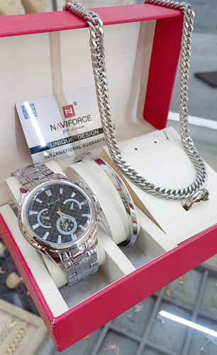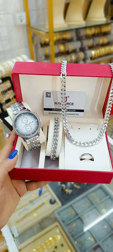 ست ساعت شیک مردانه همراه با دستبند وگردنبند وانگشتر رنگ ثابت