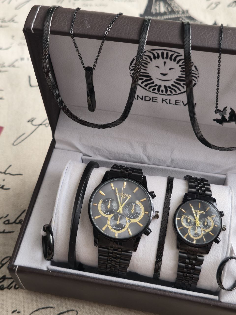 ست ساعت زنانه و مردانه سیتیزن CITIZEN بند استیل ساعت ها دارای روزشمار دو عدد دستبند و گردنبند و حلقه (سایز 6 تا 10) به همراه جعبه کادویی و باتری یدکی