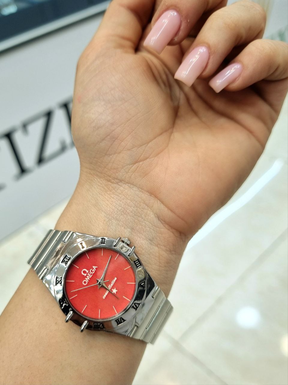 ساعت مچی زنانه Omega Constlation موتور ژاپن ضداب دارای روزشمار شیشه کریستال بند استیل رنگ ثابت قفل استیل پروانهای