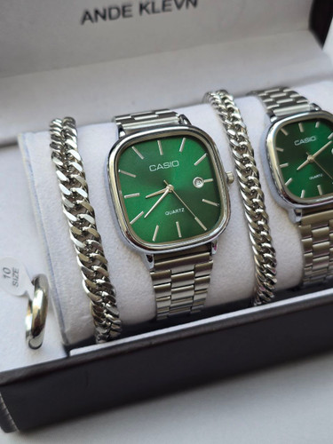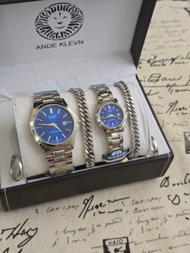 ست ساعت زنانه و مردانه برند Casio کاسیو ساعت ها دارای روزشمار دو عدد دستبند کارتیر استیل و دو تا انگشتر(سایز 6 تا 10) به همراه جعبه کادویی