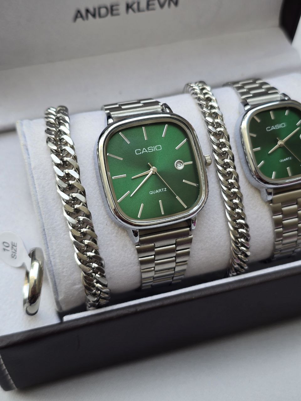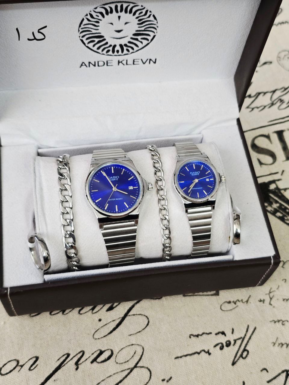ست ساعت زنانه و مردانه برند Casio کاسیو ساعت ها دارای روزشمار دو عدد دستبند کارتیر استیل و دو تا انگشتر(سایز 6 تا 10) به همراه جعبه کادویی