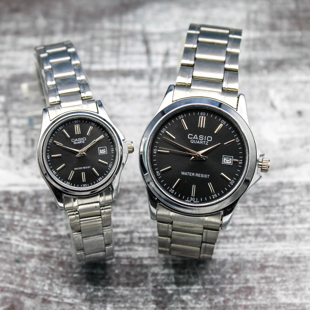 ست ساعت زنانه و مردانه ☑️CASIO Couple watch ⌚️ ست کاسیو کلاسیک قفل فشاری بند استیل موتور کوارتز تقویم دار ضدآب در حد پاشش