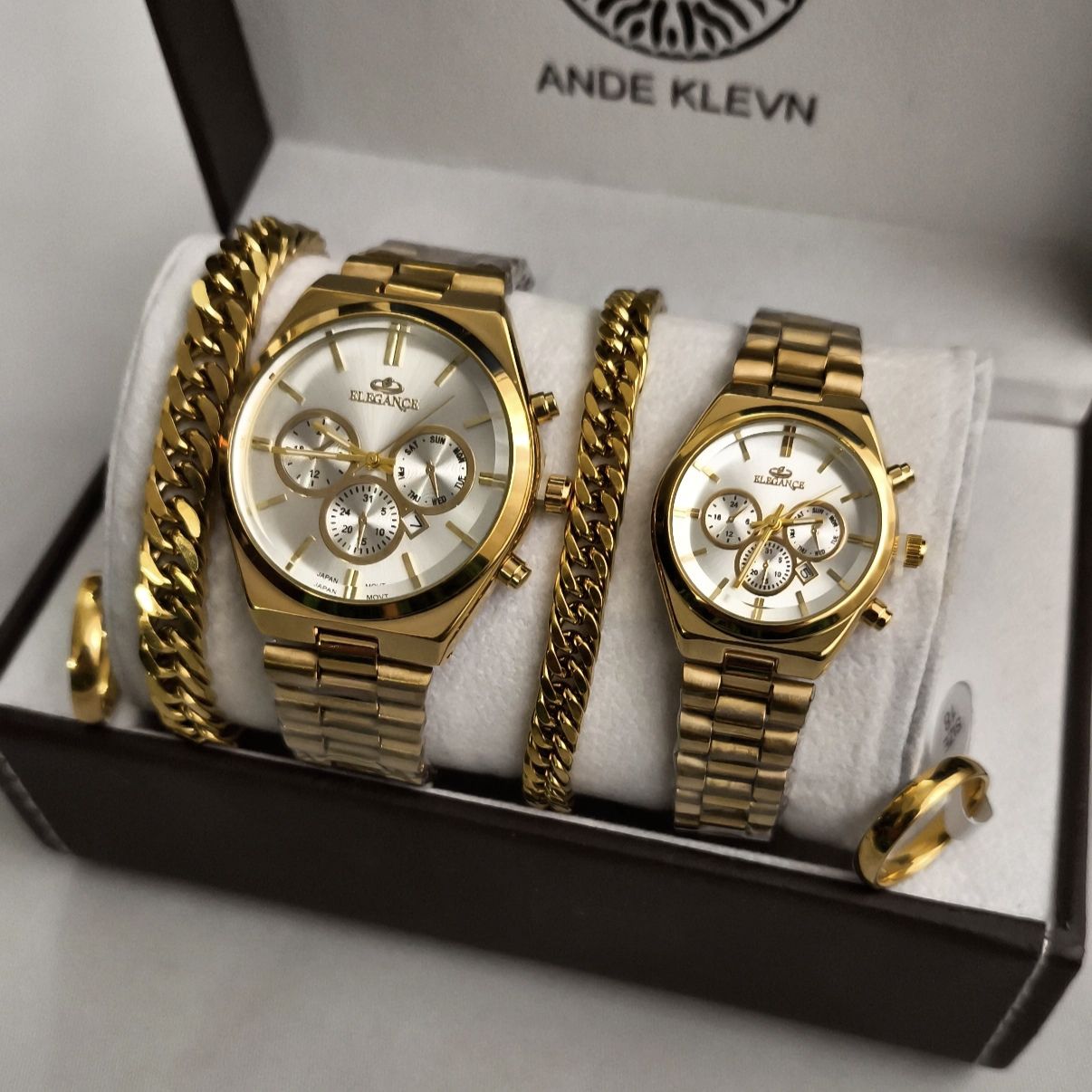 ساعت ست زنانه و مردانه برند الگانس ELEGANCE بند استیل ساعت ها دارای روزشمار دو عدد دستبند و حلقه به همراه جعبه کادویی پیشنهاد ویژه