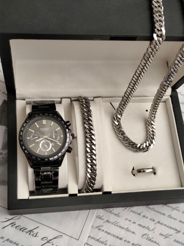 ست مردانه ساعت کاسیو تقویم دار بهمراه زیورآلات جعبه کادویی و باتری یدکی