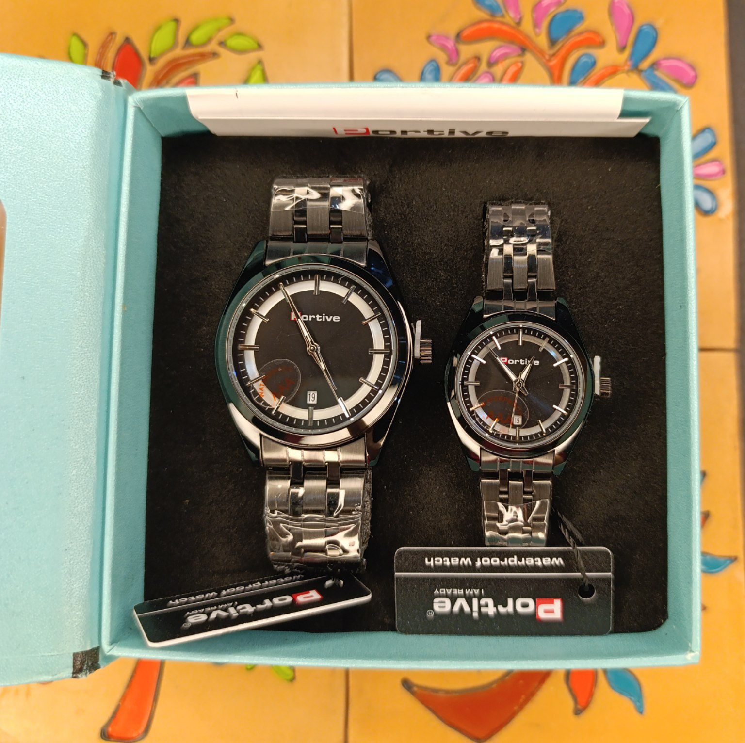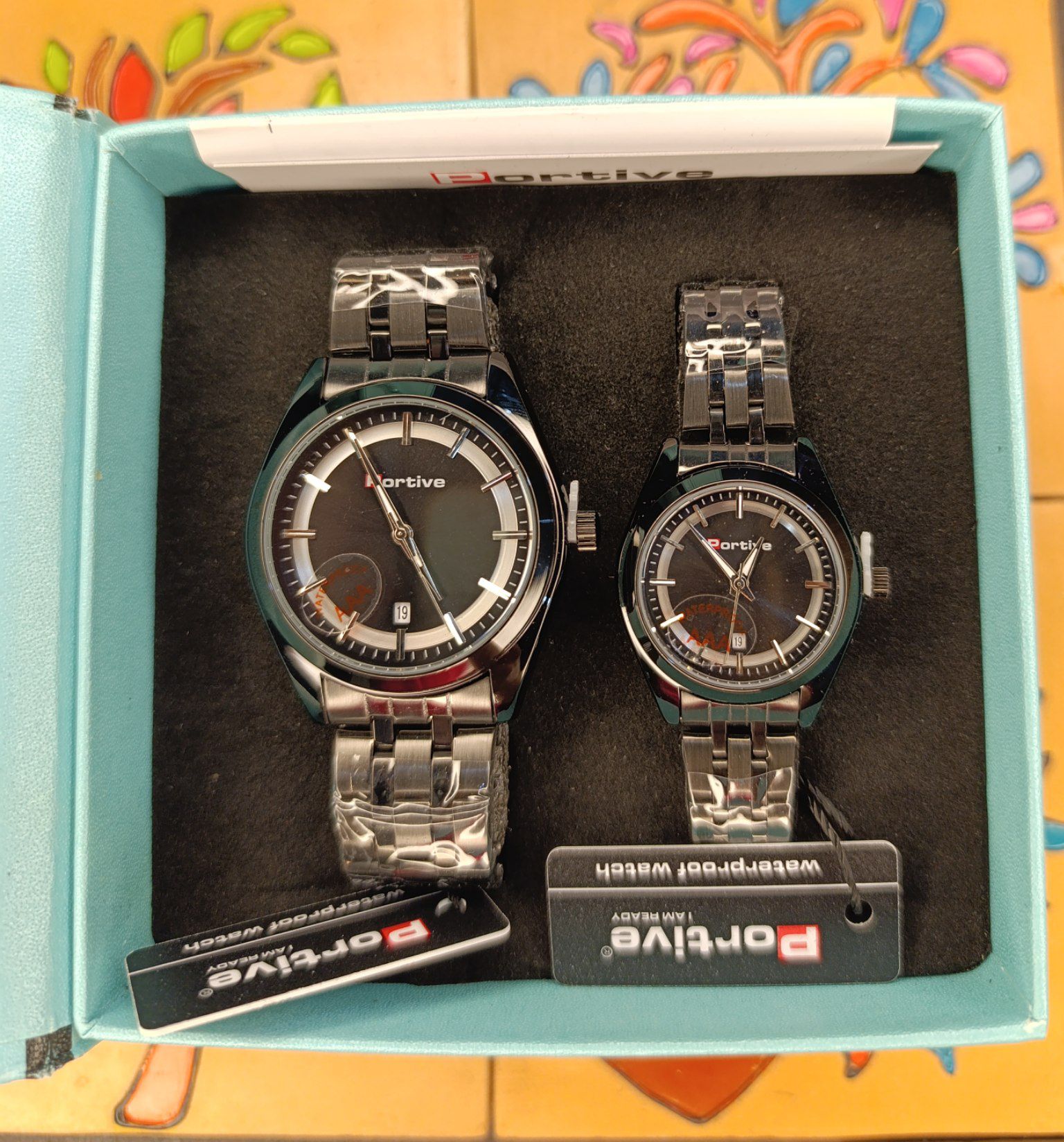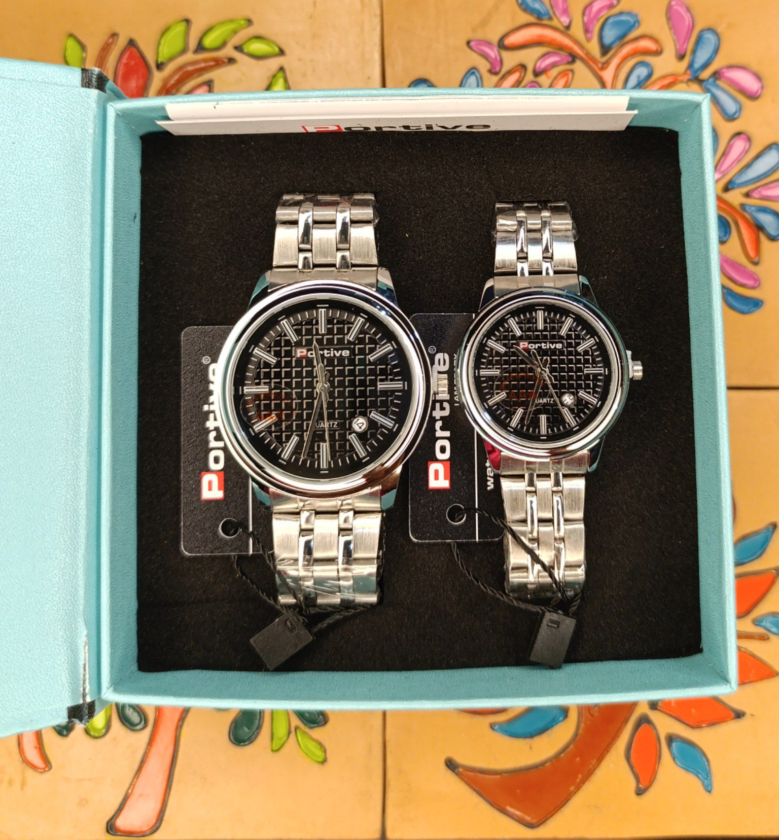 ست ساعت مچی زنانه و مردانه ✅برند پورتیو ✅بند استیل ✅در رنگ بندی صفحه ✅رنگ بند نقره‌ای و مشکی ✅جعبه مخصوص ✅کیفیت عالی ✅موتور کواتز