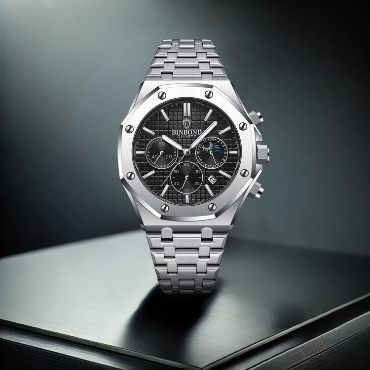 ساعت مچی مردانه ☑️BIN BOND ♤TRENDY STYLE 2025 《highe quality》 ⌚️بین باند مدلی نو اوریجینال شرکتی •مدل B3459 نمایش سان موون دارای روزشمار کرنوگراف مقاوم دربرابر آب بند استیل قاب استیل(روکش متال) شیشه کریستال دارای نمایشگر ۲۴ ساعت قفل استیل پروانه ای موتور کوارتز سه موتور فعال صفحه شب نما