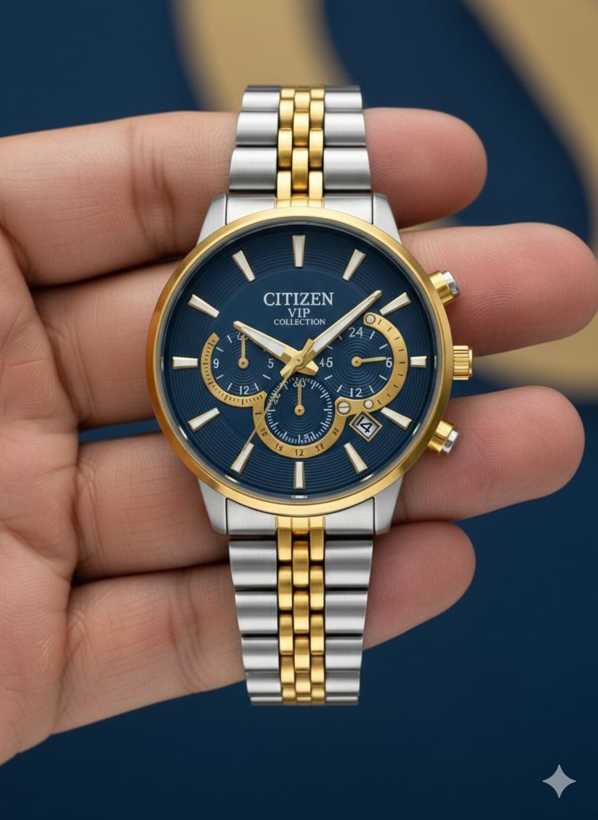 ساعت مچی زنانه زنانه برند CITIZEN قفل کلیپسی موتور کوارتز باکیفیت طراحی خاص و زیبا صفحه آبی دارای روز شمار بنداستیل طرح کرنوگراف