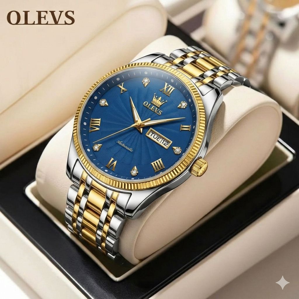 ساعت مچی مردانه برند OLEVS قفل کلیپیسی باکیفیت طراحی خاص و زیبا بند فلزی صفحه آبی موتور کوارتز روز شمار شب نما