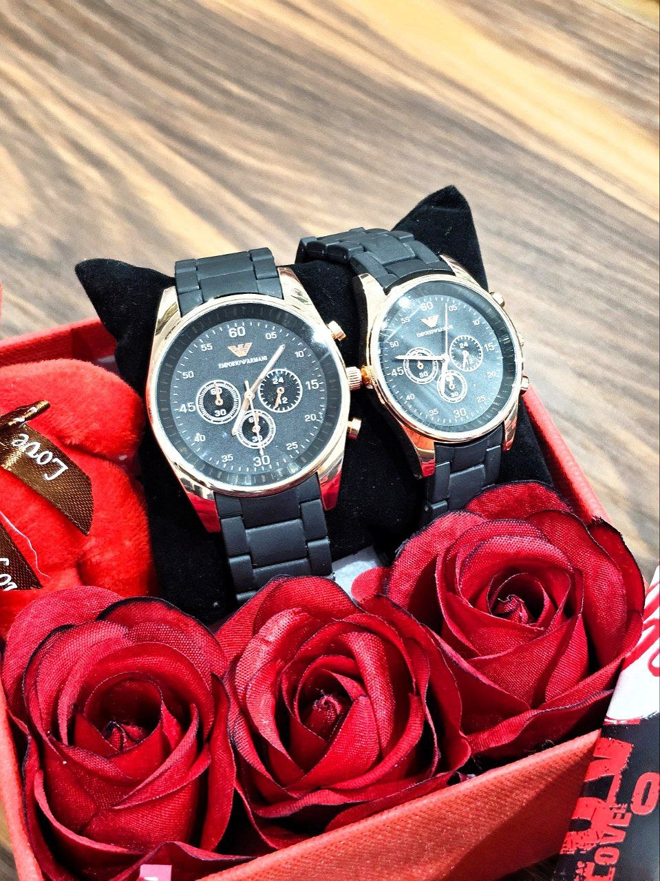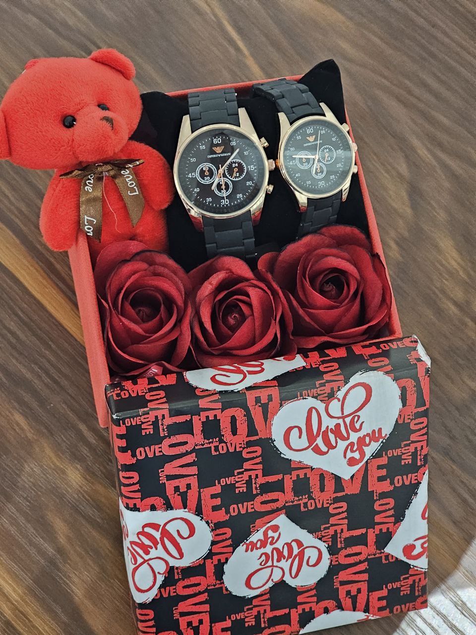 باکس هدیه دو عدد ساعت امپریو آرمانی بند فلزي با روکش سیلیکونی بهمراه جعبه و عروسک و گل A.b