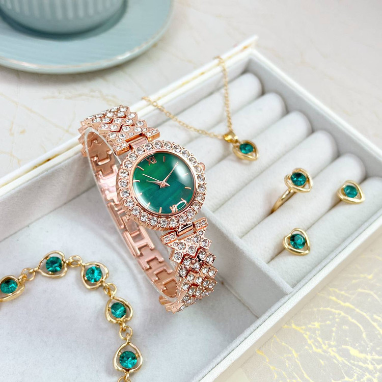 ساعت مچی زنانه صفحه سبز ➕ست هدیه: دستبند، گردنبند، انگشتر، گوشواره 💍 ✅ رنگبندی: طلایی، نقرهای، رزگلد کد محصول: 439