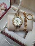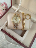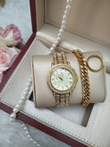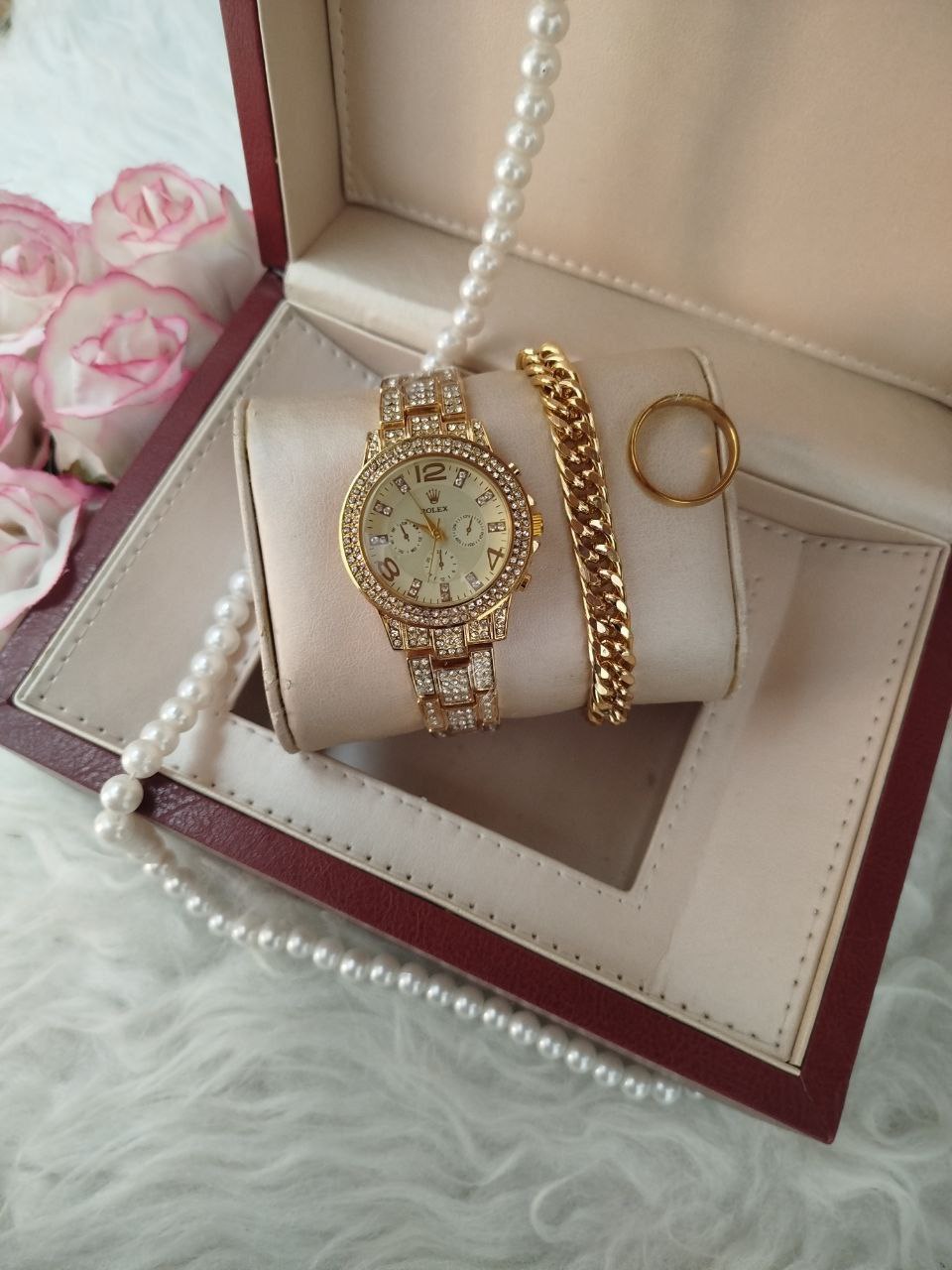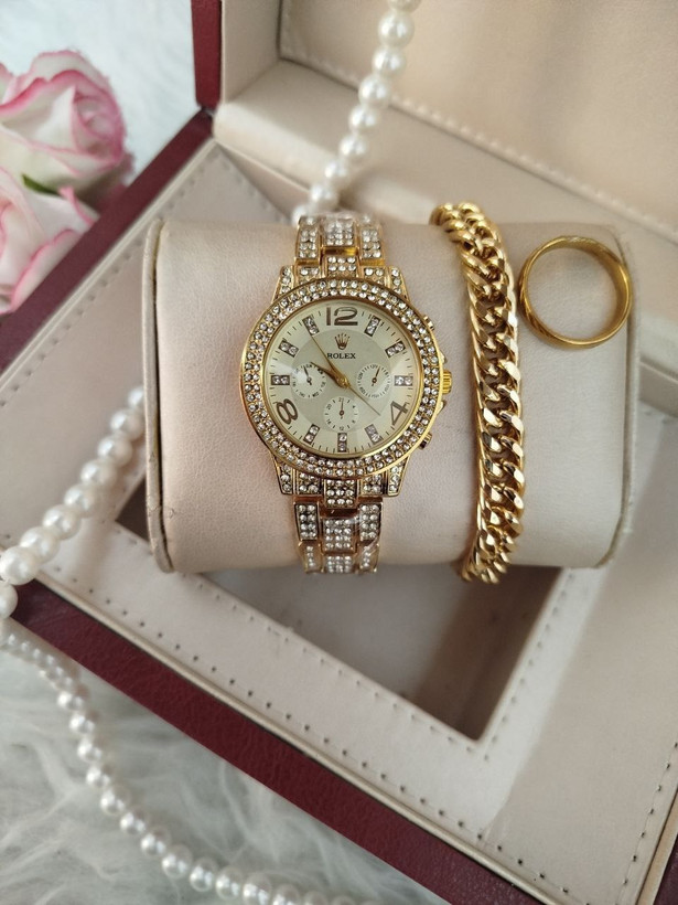 ساعت زنانه مارک رولکس ⌚️ ✔️فول نگین ✔️تک موتوره ✔️طرح سه موتوره ✔️رنگ ثابت ✔️کیفیت عالی ✔️شش ماه گارانتی موتور ✔️دارای جعبه کادویی و کارت گارانتی ⬅️قطر شیشه ساعت حدودا ۳۰ میلیمتر ✔️دستبند کارتیر رنگ ثابت ضد حساسیت ✔️حلقه ی رینگی طلایی رنگ ثابت استیل