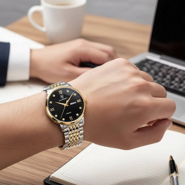 ساعت مردانه پر طرفدار از برند پوداگار❤️‍🔥 کار اورجینال از برند پوداگار📌 برند: poedagar مدل: 856 در دو رنگ صفحه مشکی و سورمه ای تاریخ دار(ایام هفته و ماه) تمام استیل بند سیلور طلایی موتور کوارتز قفل کلیپسی اعداد نگین دار قطر صفحه ۴۲ میل ضد اب (شست و شوی دست) همراه با باکس چوبی🛍️