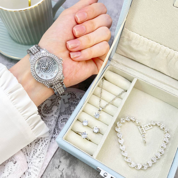 ست ساعت مچی زنانه پرنگین🤩 ➕همراه دستبند، گردنبند، انگشتر، گوشواره 💍 ✅