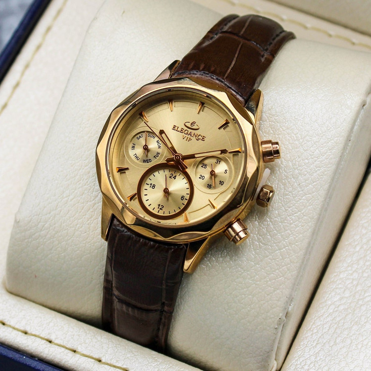 ساعت مچی زنانه ELEGANCE ✅موتور ژاپن، هر سه موتور فعال ✅فول تایم، تقویم و روزشمار ✅نمایش ۲۴ ساعت شبانه روز ✅بند چرمی، قفل پروانهای، رنگ ثابت ✅یک سال گارانتی موتور و رنگ ✅جعبه