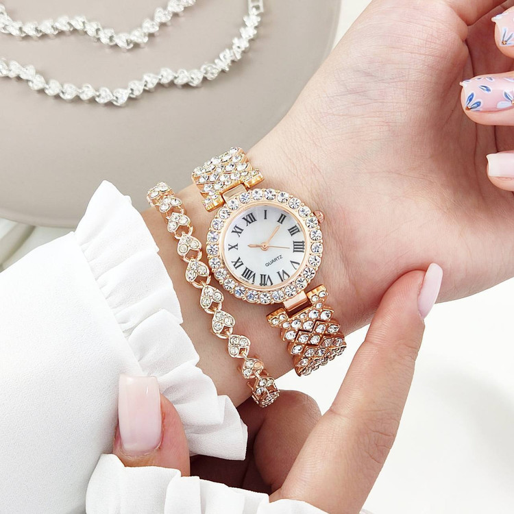 ست ساعت مچی زنانه نگیندار🤩 ➕همراه دستبند، گردنبند، انگشتر، گوشواره 💍 رنگبندی: نقرهای، طلایی، رزگلد