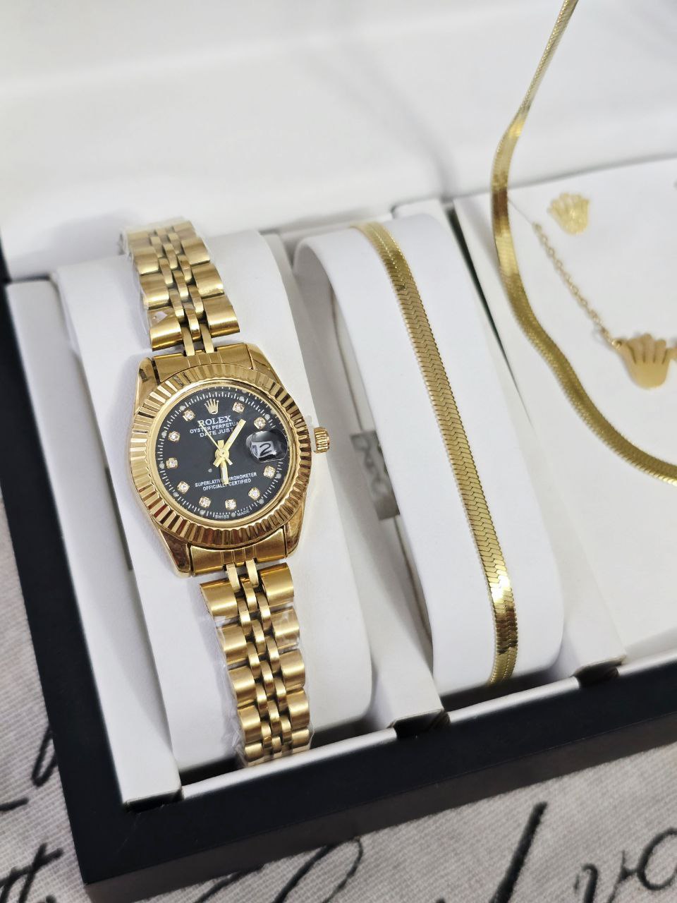 ست زنانه و دخترانه ساعت رولکس تقویم دار و دستبند و نیمست استیل و حلقه