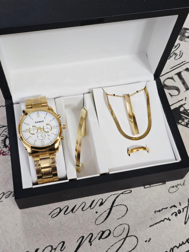 ست مردانه ساعت کاسیو تقویم فعال و بنگل و گردنبند و حلقه