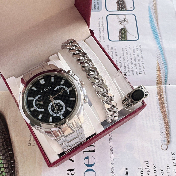ست لوکس مردانه ساعت استیل تایوانی مارک WALAR و دستبند و انگشتر کارتیر فول استیل رنگ ثابت