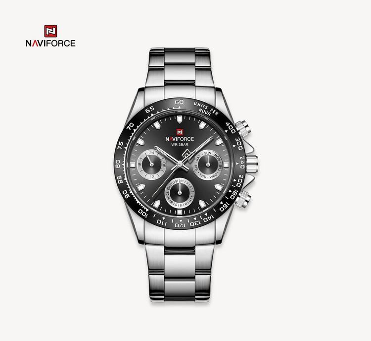 اطلاعات محصول :۳ موتور فعال روزشمار نمایش روزهای هفته نمایش زمان به صورت ۲۴ ساعته قطر صفحه ۳۹ میلیمتر بند استیل شیشه کریستالی مقاوم در برابر ضربه و خش قفل استیل ضدآب در حد دست شستن