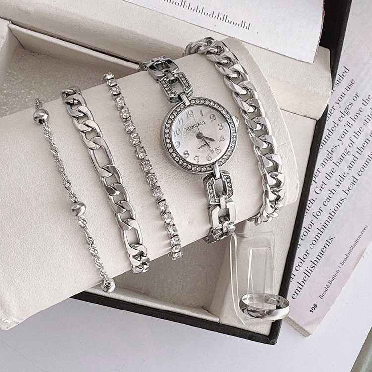 اطلاعات محصول :♦️ ساعت استیل زنانه مارک HONGRUI ♦️دستبند کارتیر فیگارو فول استیل رنگ ثابت ♦️دستبند کارتیر تراش رنگ ثابت ♦️دستبند تنیسی فول نگین ♦️دستبند توپی فول استیل طرح طلا ♦️انگشتر استیل رنگ ثابت ♦️با جعبه شیک ساعت
