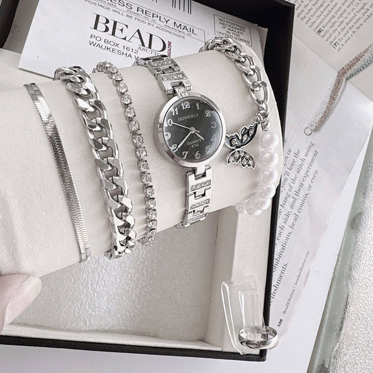 اطلاعات محصول :♦️ ساعت استیل زنانه مارک HONGRUI ♦️دستبند کارتیر تراش رنگ ثابت ♦️دستبند تلفیقی مراورید و زنجیر کارتیر با آویز پروانه ♦️دستبند تنیسی فول نگین ♦️دستبند ماری فول استیل طرح طلا ♦️انگشتر استیل رنگ ثابت ♦️با جعبه شیک ساعت