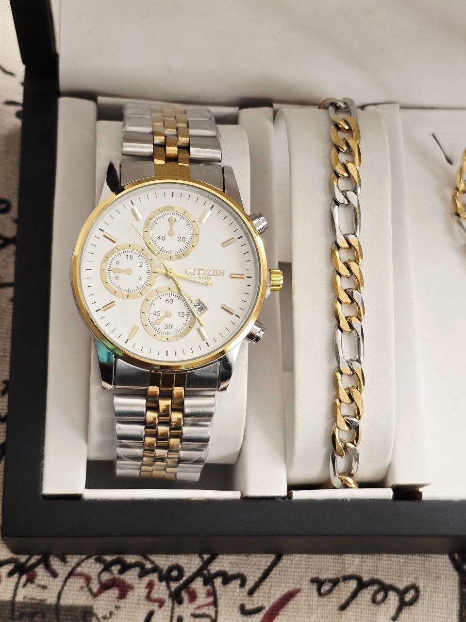مشخصات: ست مردانه ساعت سیتیزن تقویم فعال و دستبند و گردنبند زنجیر استیل طلایی و حلقه استیل بهمراه جعبه کادویی و باتری یدکی