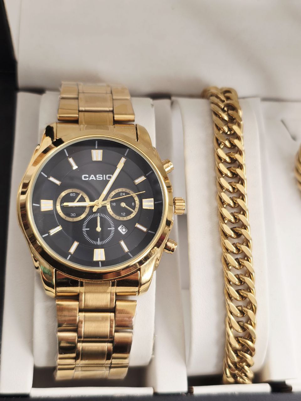 ست مردانه ساعت کاسیو و دستبند و گردنبند زنجیر استیل طلایی و حلقه استیل( سایز ۶ تا ۱۰) بهمراه جعبه کادویی و باتری