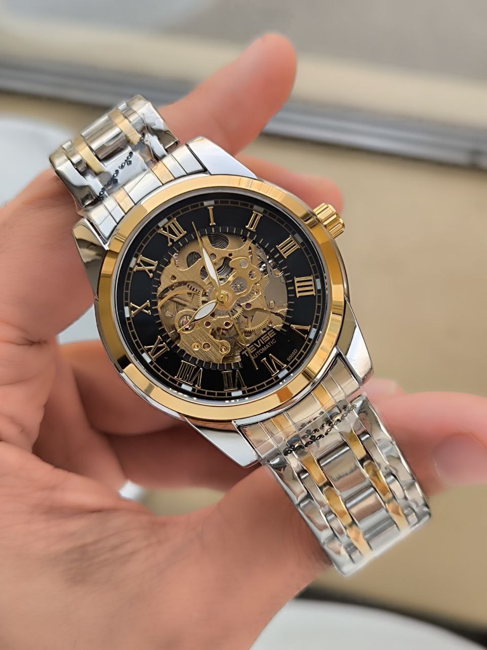 مشخصات: ساعت مردانه اتومات مارک tevise 9005d اتوماتیک (بدون نیاز به باطری) رنگ ثابت دو قفله مخفی پشت شیشه ایی قاب و بند استیل کیفیت بسیار عالی دارای اعداد یونانی همراه