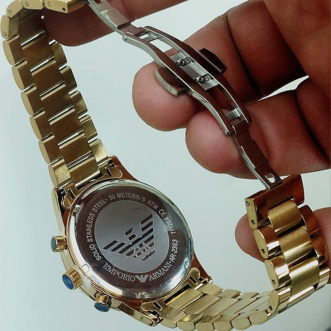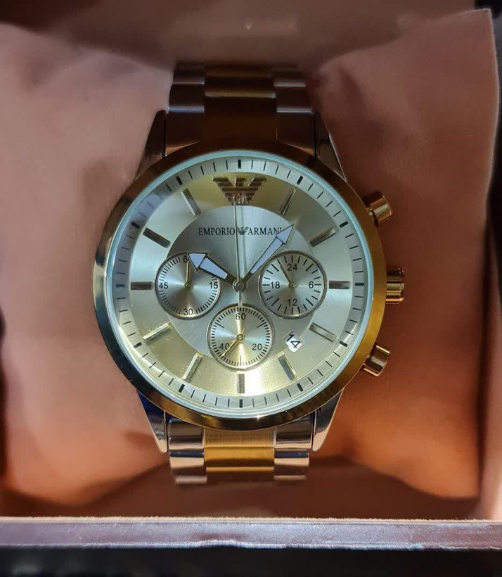 ساعت مچی مردانه EMPORIO ARMANI Cornograf 2363 سه موتور کرنوگراف دارای روز شمار قفل استیل پروانه ای (مخفی) بند استیل رنگ ثابت موتورکوارتز کرنو ضدآب قاب طلایی کرنوگراف ارسال به همراه جعبه VIP کد 15001700