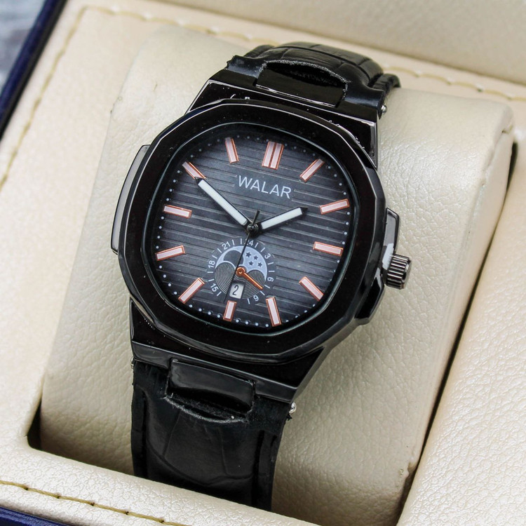 مشخصات: ⌚ساعت مچی مردانه WALAR ✅تقویمدار، رنگ بندی ✅بند چرمی، قفل کمربندی ✅جعبه کادویی و باطری رایگان