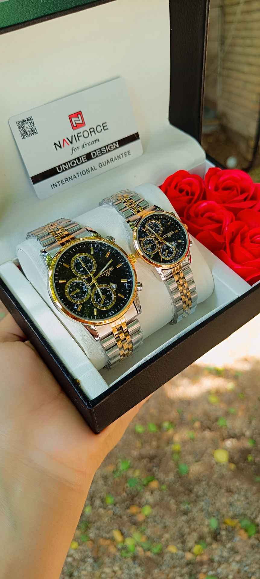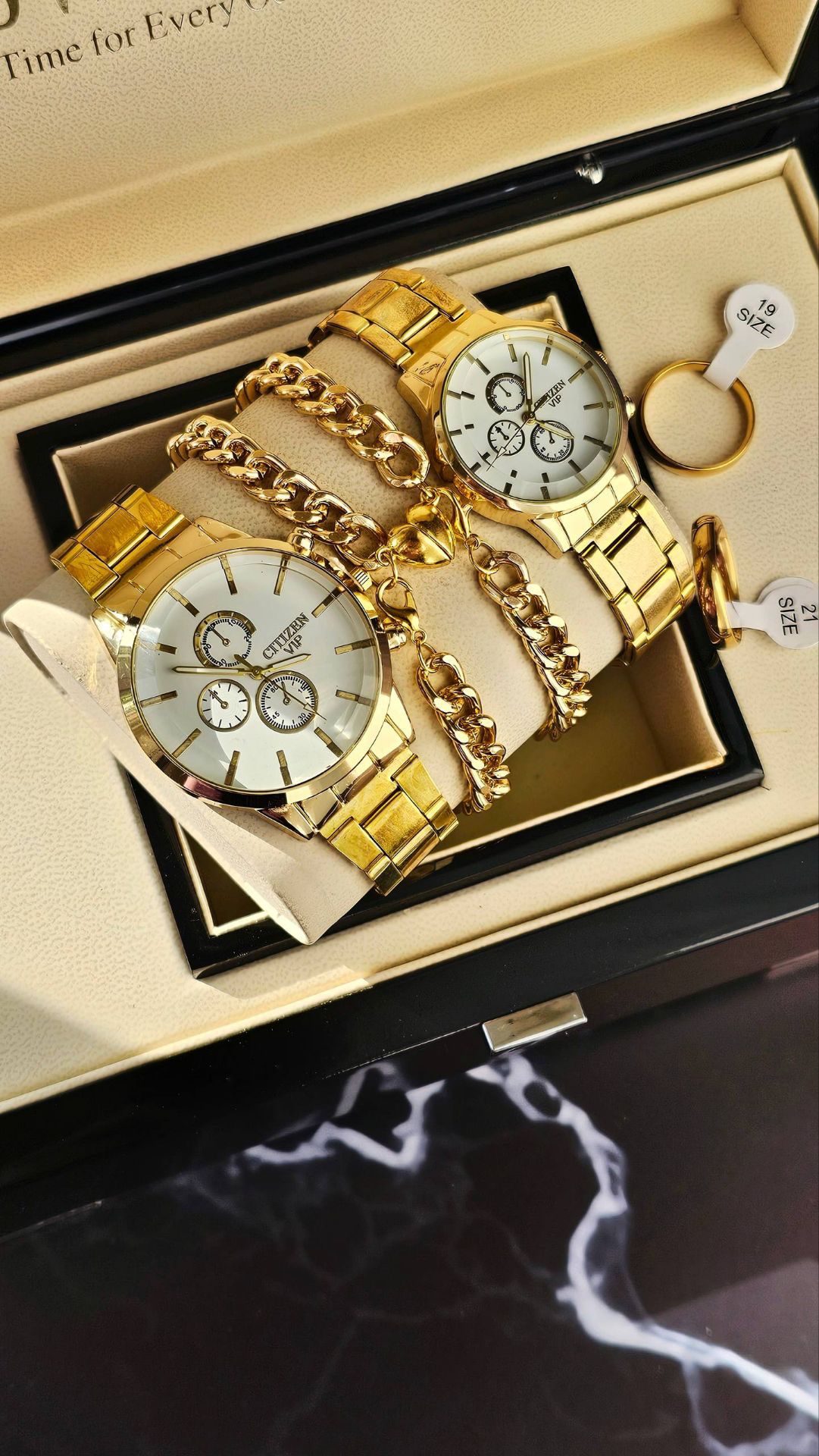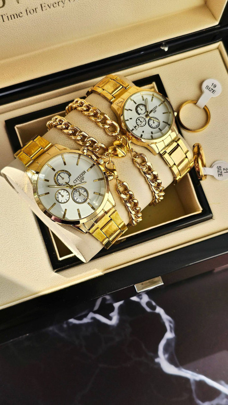 مشخصات: 🪯ست ساعت مارک سیتیزن وی آی پی 🪯کیفیت عالی ☯️رنگ ثابت ☯️دسته استیل 🪯ضد آب ☯️تاریخدار