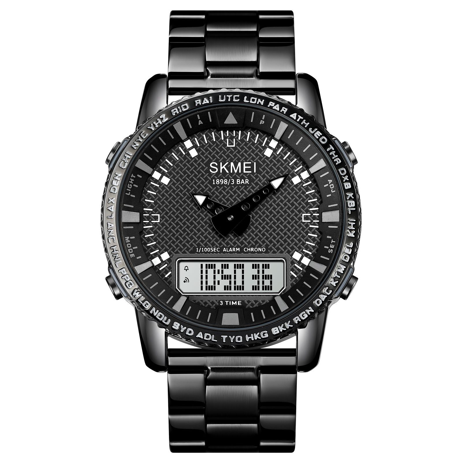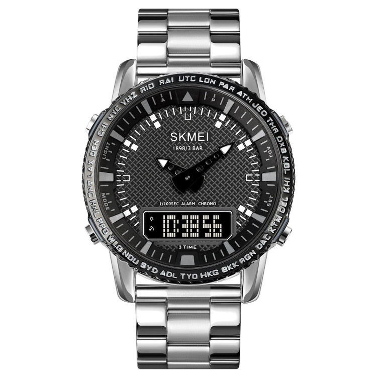 ساعت مچی مردانه اسکمی مدل SKMEI 1898 موتور برقی ۳ زمانه بند استیل رنگ ثابت قفل استیل ضد آب در حد دست شستن کرونومتر آلارم تقویم قطر صفحه ۴۵ میلیمتر عقربه ها شب تاب نمایش روزهای هفته