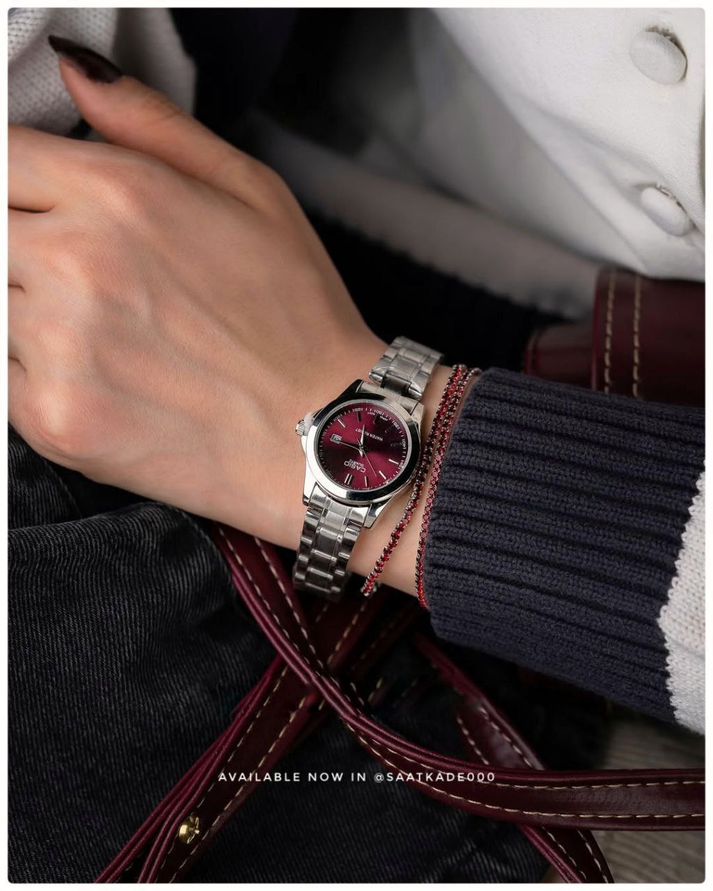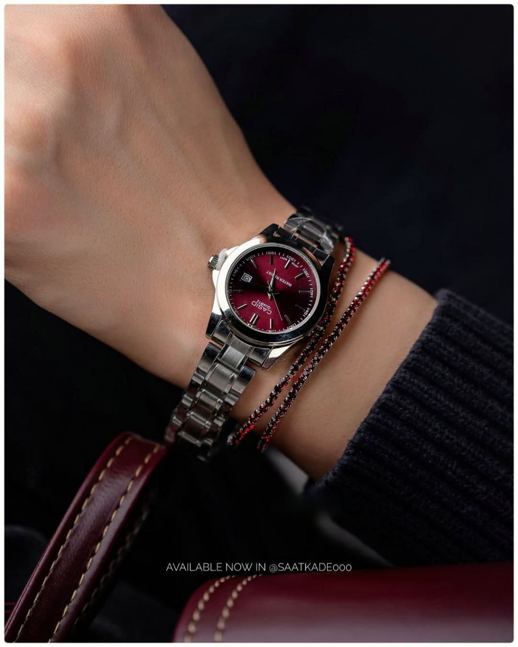 Casio ساعت کاسیو کلاسیک رنگ چری برای خانمها موتور بسیار باکیفیت دارای روزشمار بند و قفل استیل ضدآب درحد دست شستن به همراه: جعبه و یک باتری اضافی
