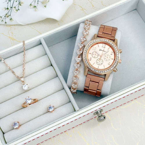 ست ساعت مچی زنانه جنوا🤩 ➕همراه دستبند، گردنبند، انگشتر، گوشواره 💍 رنگبندی: نقرهای، طلایی، رزگلد کد محصول: 417