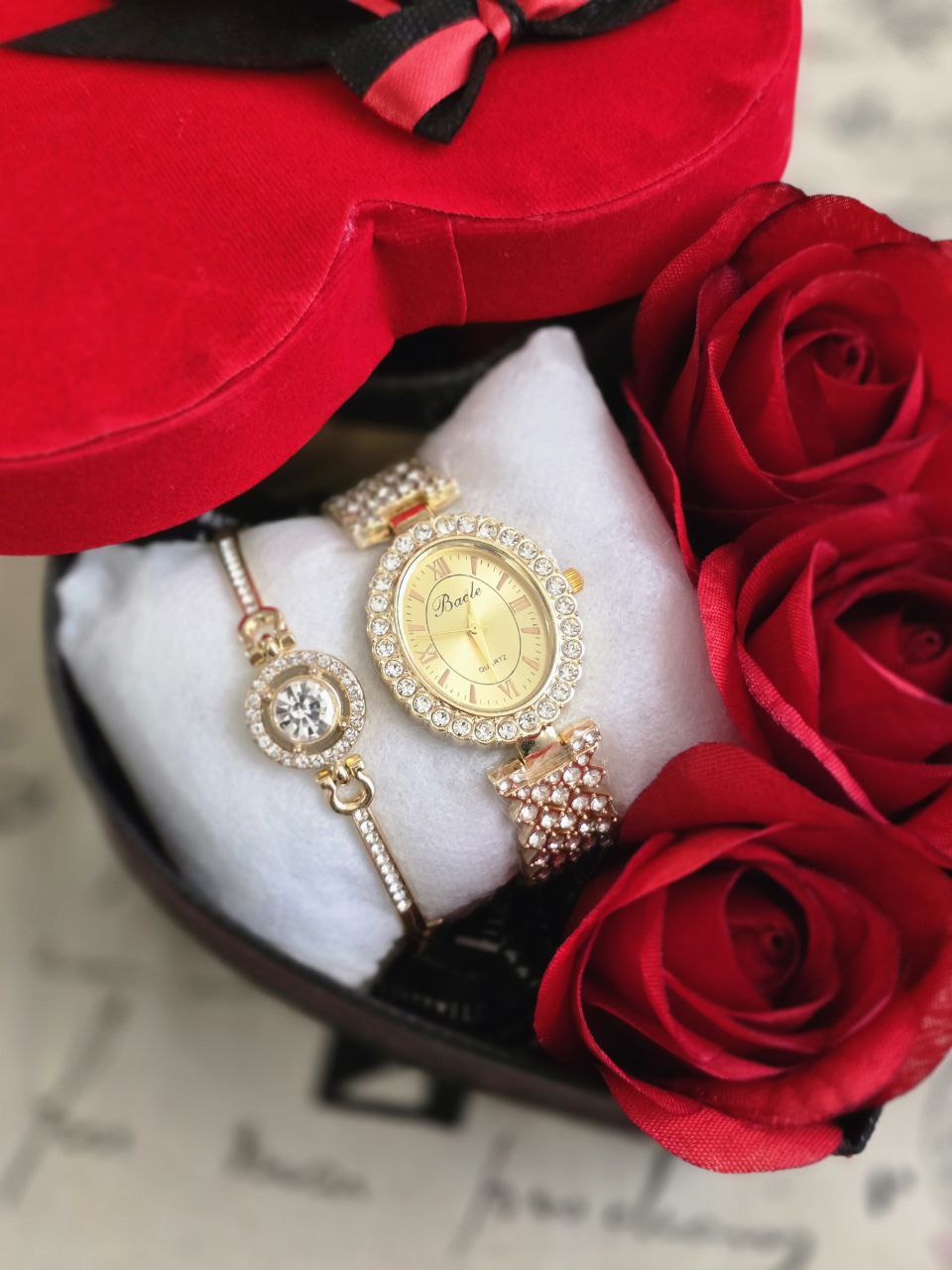 باکس هدیه زنانه شامل ساعت و دستبند و باکس و گل