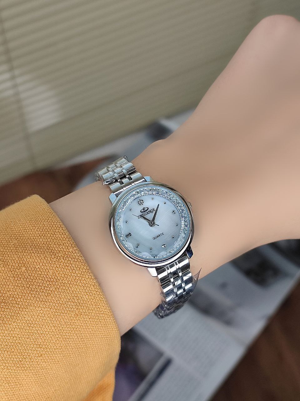 ساعت زنانه مارک الگانس ELEGANCE 120013001612 رنگ ثابت موتور ژاپن دو قفله مخفی صفحه نگین دار قاب و بند استیل دارای اعداد یونانی کیفیت بسیار عالی همراه با جعبه شیک