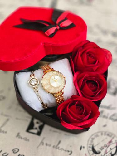 باکس هدیه زنانه شامل ساعت و دستبند و باکس و گل