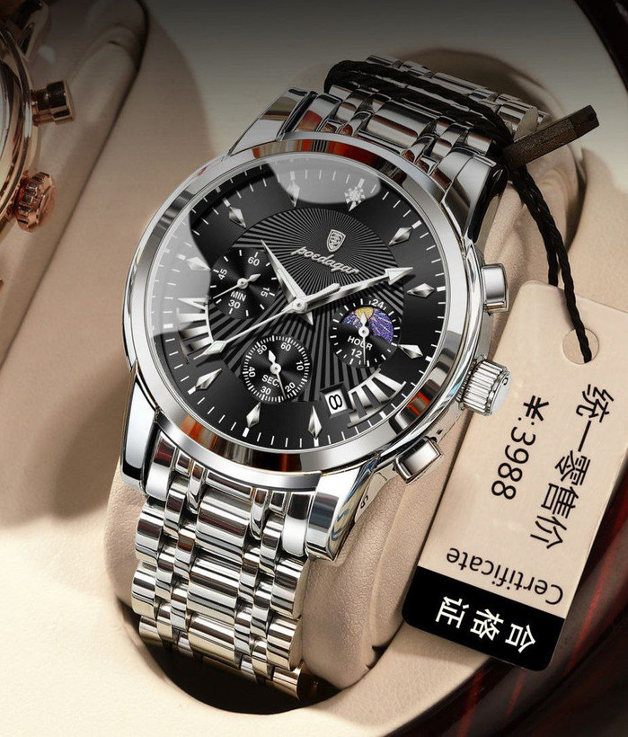 ساعت پوداگار مردانه کرنوگراف دارای روز شمار نمایش مون استار عقربه شب نما برند اورجینال شرکتی بند استیل ضدآب تا عمق بالا رنگ ثابت قفل دو پروانه