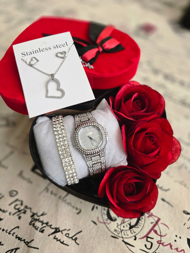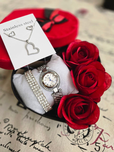 باکس هدیه زنانه شامل ساعت و دستبند و نیمست استیل رنگ ثابت و باکس و گل