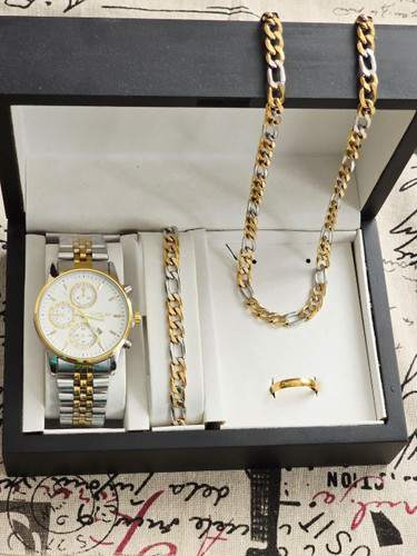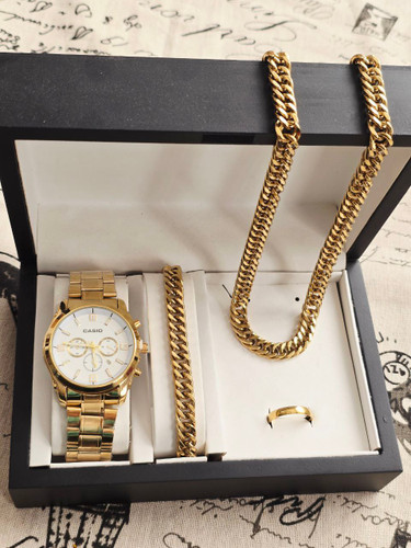 ست مردانه ساعت کاسیو و دستبند و گردنبند زنجیر استیل طلایی و حلقه استیل( سایز ۶ تا ۱۰)
