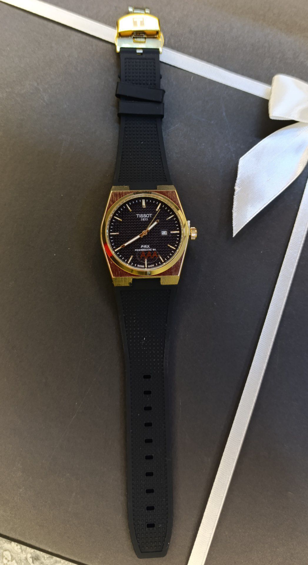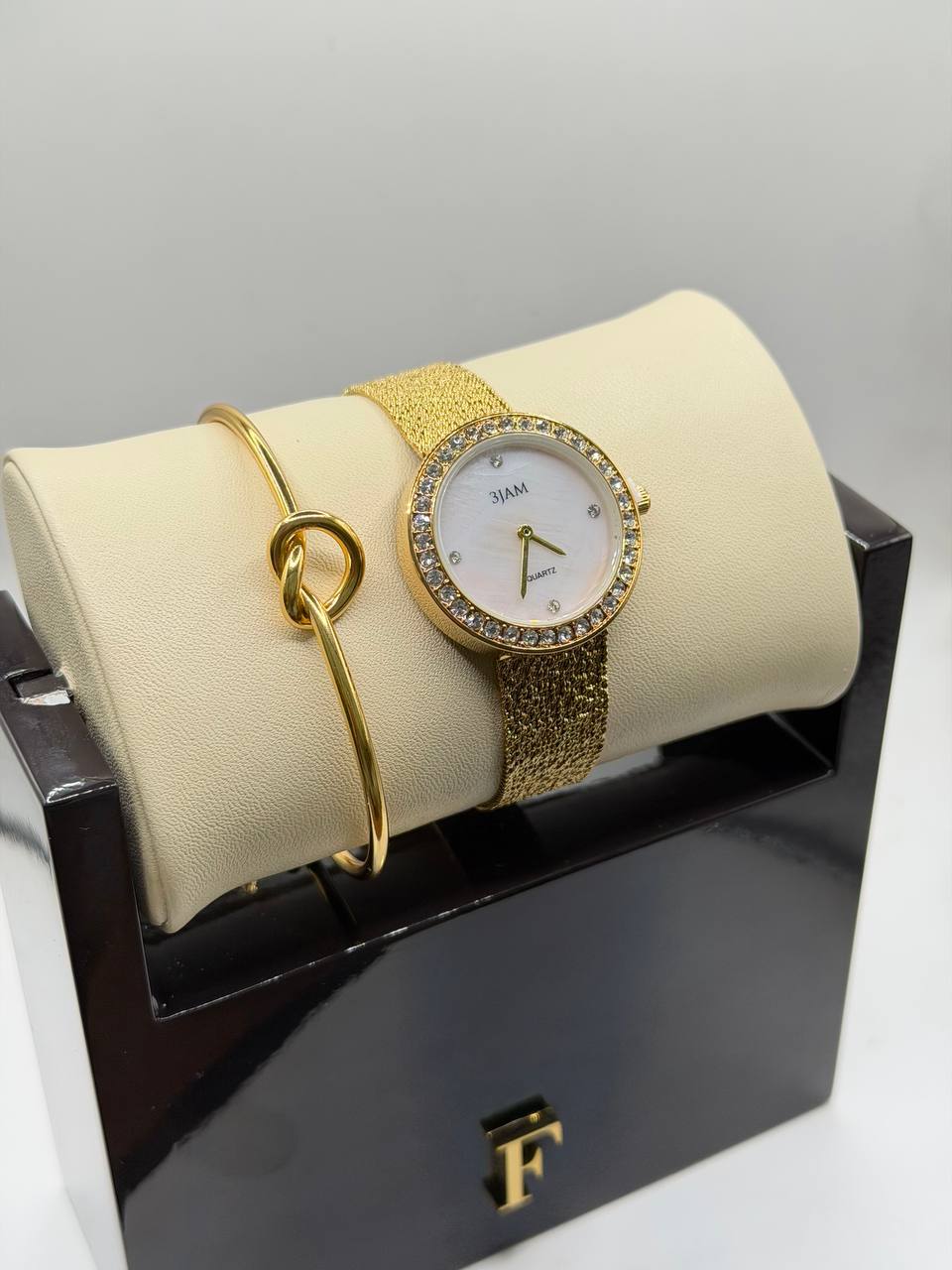 ساعت 3jam برند شرکتی و سفارش دوبی بند طرح طلا کوب و قفل ریلی به همراه دستبند زنانه