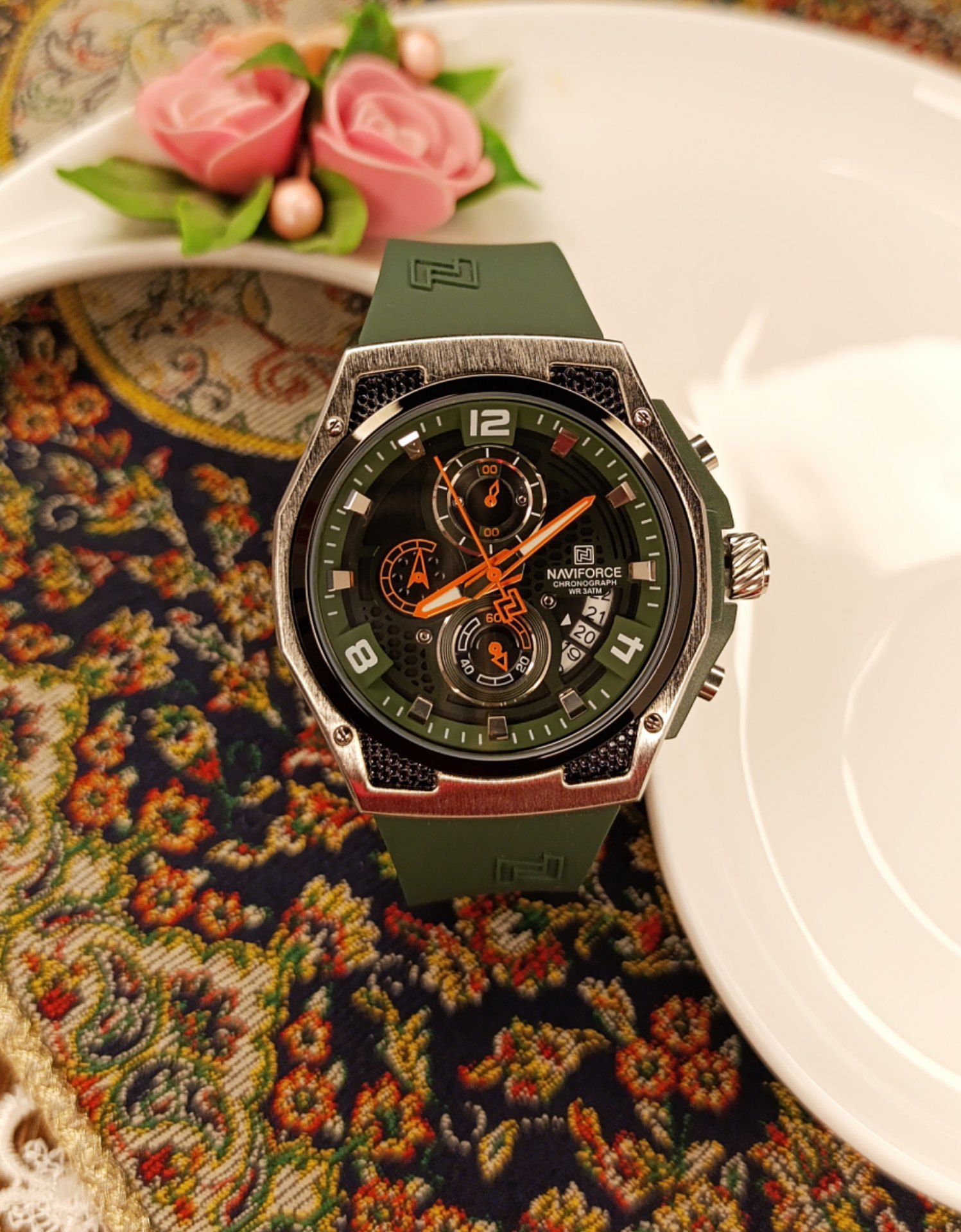 ساعت مچی :مردانه ✅برند :ناوی فورس ✅نشانگر تاریخ ، کرنومتر و دهم ثانیه کرنومتر ✅بند :سیلیکونی مقاوم ✅شیشه: معدنی مقاوم در برابر خش ✅قطر صفحه : 45 میلیمتر ✅ضخامت ساعت : 12 میلیمتر ✅وزن ساعت : 84 گرم ✅رنگ های به کار رفته : مشکی ، رزگلد نقرهای