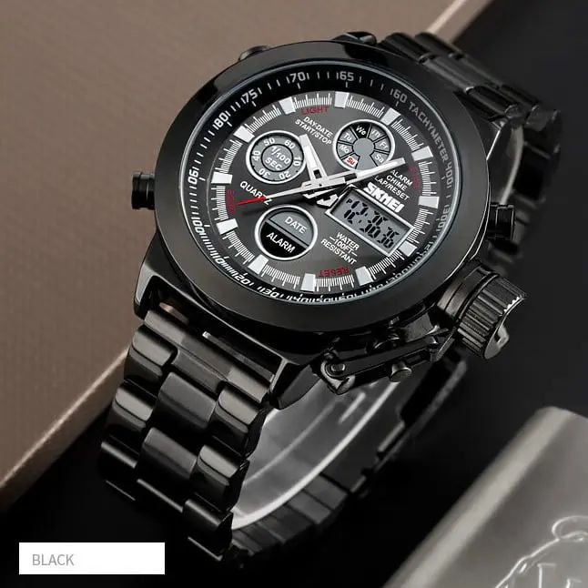 ساعت مچی مردانه Skmei دو زمانه اورجینال رنگ ثابت ضدآب تقویم هفته و روز شمار آلارم بک لایت کرنومتر قطر ۴۴ میلی متر شیشه ضدخش