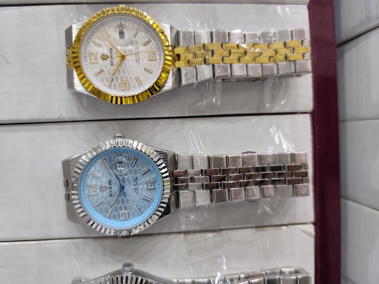 ساعت مچی زنانه ☑️BIN BOND ♤TRENDY STYLE 2025 《highe quality》 ⌚️بین باند مدلی نو زنونه اوریجینال شرکتی ایام هفته دارای روزشمار مقاوم دربرابر آب بند استیل قفل استیل پروانه ای موتور کوارتز شیشه الماس صفحه شب نما خاص و جذاب