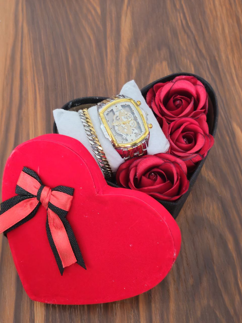 باکس هدیه زنانه شامل ساعت و دستبند و نیمست استیل طلایی رنگ ثابت و باکس و گل