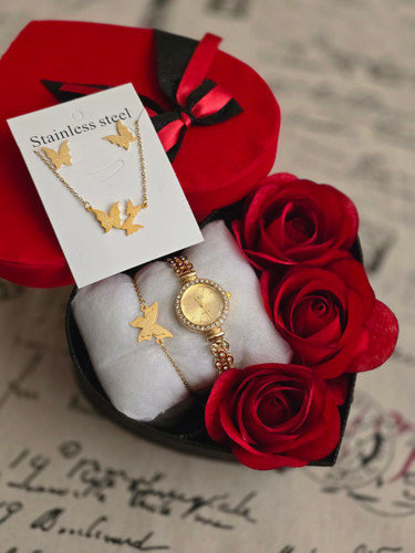 باکس هدیه زنانه شامل ساعت و دستبند و نیمست استیل طلایی رنگ ثابت و باکس و گل
