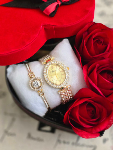 باکس هدیه زنانه شامل ساعت و دو عدد دستبند و باکس و گل