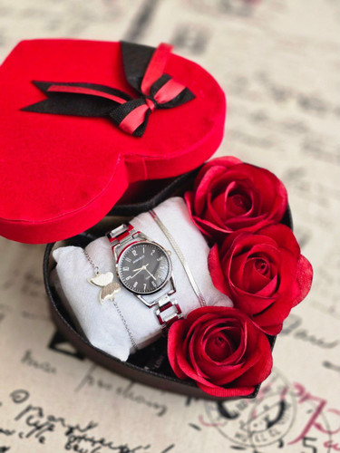 باکس هدیه زنانه شامل ساعت و دستبند و باکس و گل