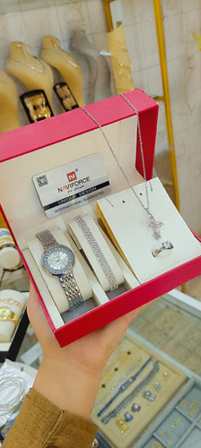 ست زنانه و دخترانه ساعت ونکلیف و نیمست استیل و حلقه بهمراه جعبه کادویی و باتری یدکی