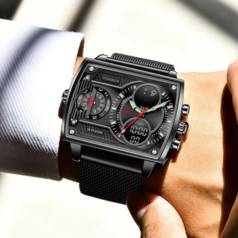 ساعت مچی مردانه brand foxbox Model 0011 اورجینال فاکس باکس 3 زمانه نمایش روز شماره و ایام هفته کرنومتر بک لایت قوی شیشه باداوم ضدآب تنظیم زنگ هشدار ( آلارم ) بند استیل بادوام و با کیفیت نمایش PM / AM